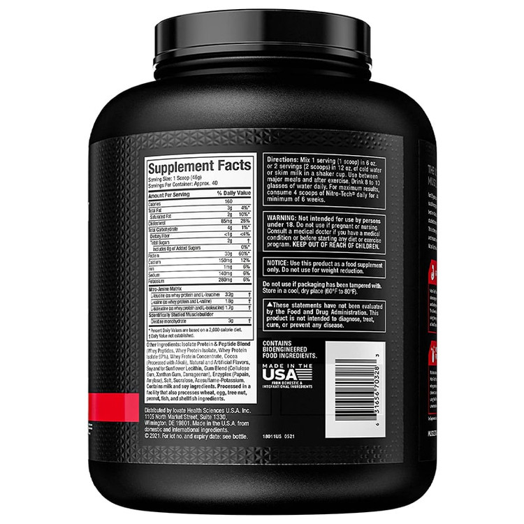 ✔️۳۰گرم پروتئین و ۳ گرم کراتین کربوهیدرات در هر اسکوپمعرفی محصولمکمل نیتروتک پروتئین وی ماسل تک سرشار از پروتئین وی است که 30 گرم پروتئین وی ممتاز را در اختیار شما قرار میدهد که عمدتاً از پپتیدهای پروتئین وی و پروتئین وی ایزوله شده هستند. این مکمل 70 درصد بیشتر نسبت به پودرهای وی معمولی عضله می سازد و ریکاوری را افزایش می دهد.مکمل نیتروتک حاوی پروتئین هایی است که فرآیند فیلتراسیون چند فازی را طی می کنند تا پروتئین خالص ایزوله را به شما بدهد که به راحتی با آب مخلوط شده و سریعتر جذب بدن می شوند.پروتئین وی نیتروتک با 3 گرم کراتین، می تواند عضله بیشتری نسبت به پروتئین به تنهایی بسازید. این مکمل از برند ماسل تک قدرت شما را افزایش می دهد و با هر بار فشار تمرین، انرژی عضلات لاغر را بیشتر ریکاوری می کند. همچنین این مکمل حاوی 6.7 گرم بی سی ای ای است که به بهبود سریعتر خستگی کمک می کند.نیتروتک یک مکمل سازنده عضله وی مهندسی شده است که برای همه ورزشکارانی طراحی شده است که به دنبال عضلات بیشتر، قدرت بیشتر و عملکرد بهتر هستند.توضیحات تکمیلیمکمل نیتروتک وی پروتیین ماسل تک حاوی پودر پروتیین وی است که از آب پنیر صد در صد گرفته شده است و پروتیین کافی برای رشد عضلات را به صورت روزانه تامین می کند. این مکمل موجب افزایش قدرت بدنی و عضلات و افزایش رشد ماهیچه ها بدون چربی می گردد.مکمل نیتروتک برای افرادی که می خواهند محدودیت های خود را پشت سر بگذارند و اهداف جدیدی را تعیین کنند عالی است.با مشخصات کامل اسید آمینه ضروری و فواید افزوده شده نیتروتک به شما توده عضلانی بدون چربی می دهد که از تمیزترین پروتئین ها (پروتئین وی ایزوله و پپتیدهای وی) به دست می آید و به دستاوردهای شما می افزاید.MuscleTech Nitro Tech Whey Proteinویژگی های محصول